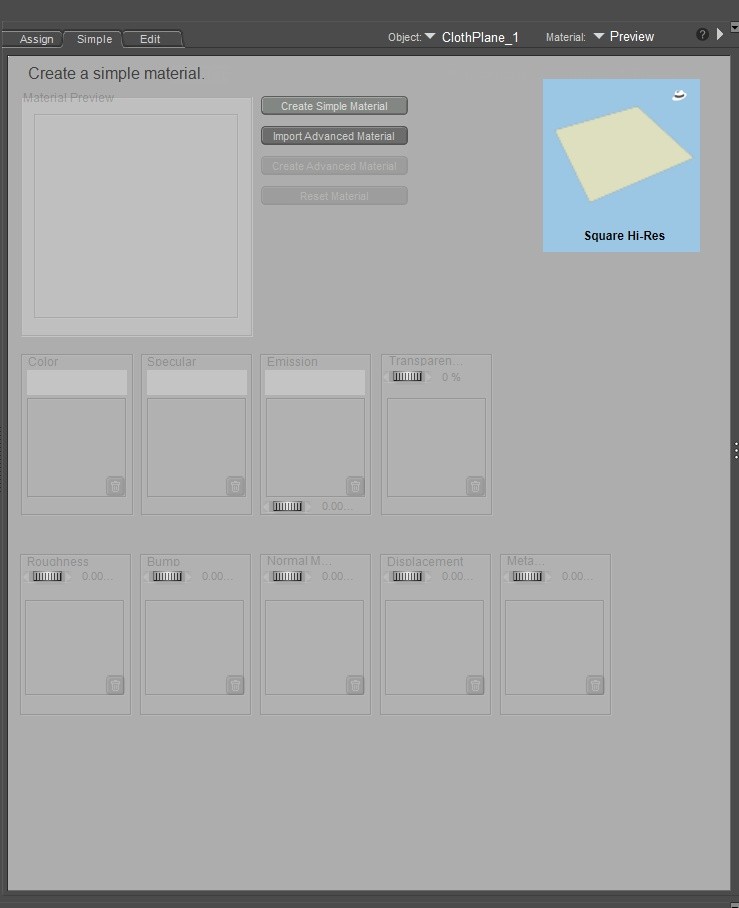 We’re applying the material to the Hi‑Res Square (also known as the Cloth Plane). This prop is ideal because it handles displacement especially well, giving you more realistic surface depth.  Especially with Superfly renders you may want to subdivide props further for even more enhanced displacement.