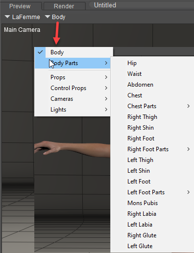 - Body Parts: Selecting Current Actor > Body Parts opens the list of the currently selected figure’s body parts. By using this option, you will select only the specified body part on the currently selected figure.