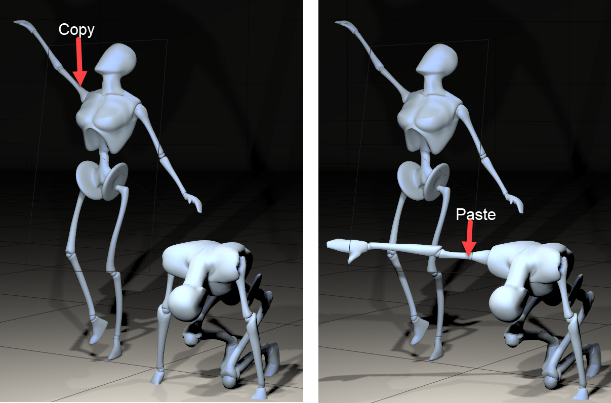 Selecting Edit > Copy copies selected elements to the Clipboard. You can use this command to copy the position of one prop to another. You can also copy transformation and rotation channel information from the selected item and paste that information into another item. For example, the following figure shows pose information pasted from one character's right shoulder rotations pasted to the right shoulder of another character.