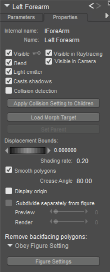 Visible: Checking the Visible checkbox makes the body part visible and vice versa. Invisible objects are not included in any render calculations, and do not appear in the rendered scene. See Figure Properties for information on animating the Visible property.