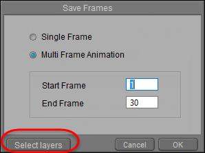 If you are saving a Pose set that contains Animation Layers, the Save Frames dialog will include a Select Layers button. Click this button to select the animated layers that you want to include in your scene. For more information on Animation Layers, see Layers Tab.