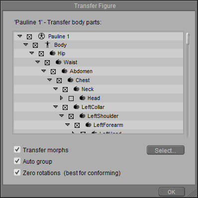 - The Transfer Figure dialog appears. Use the Hierarchy List to check or uncheck the body parts that you want to keep in the figure.