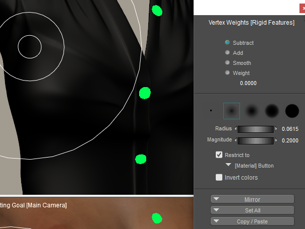 Unlike the Soft Features method, initially there are no vertices assigned to the Rigid Features method. However, you can select vertices by material as described in the Soft Features section. In the case of this shirt, you would check the Restrict To option, and select the Button material to assign them to the Rigid Features method as shown in the following figure.