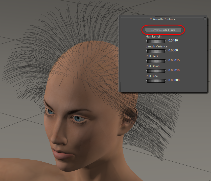 As the name implies, guide hairs influence how nearby hairs will grow. To do this, click the Grow Guide Hairs button. The currently selected hair group will sprout guide hairs.