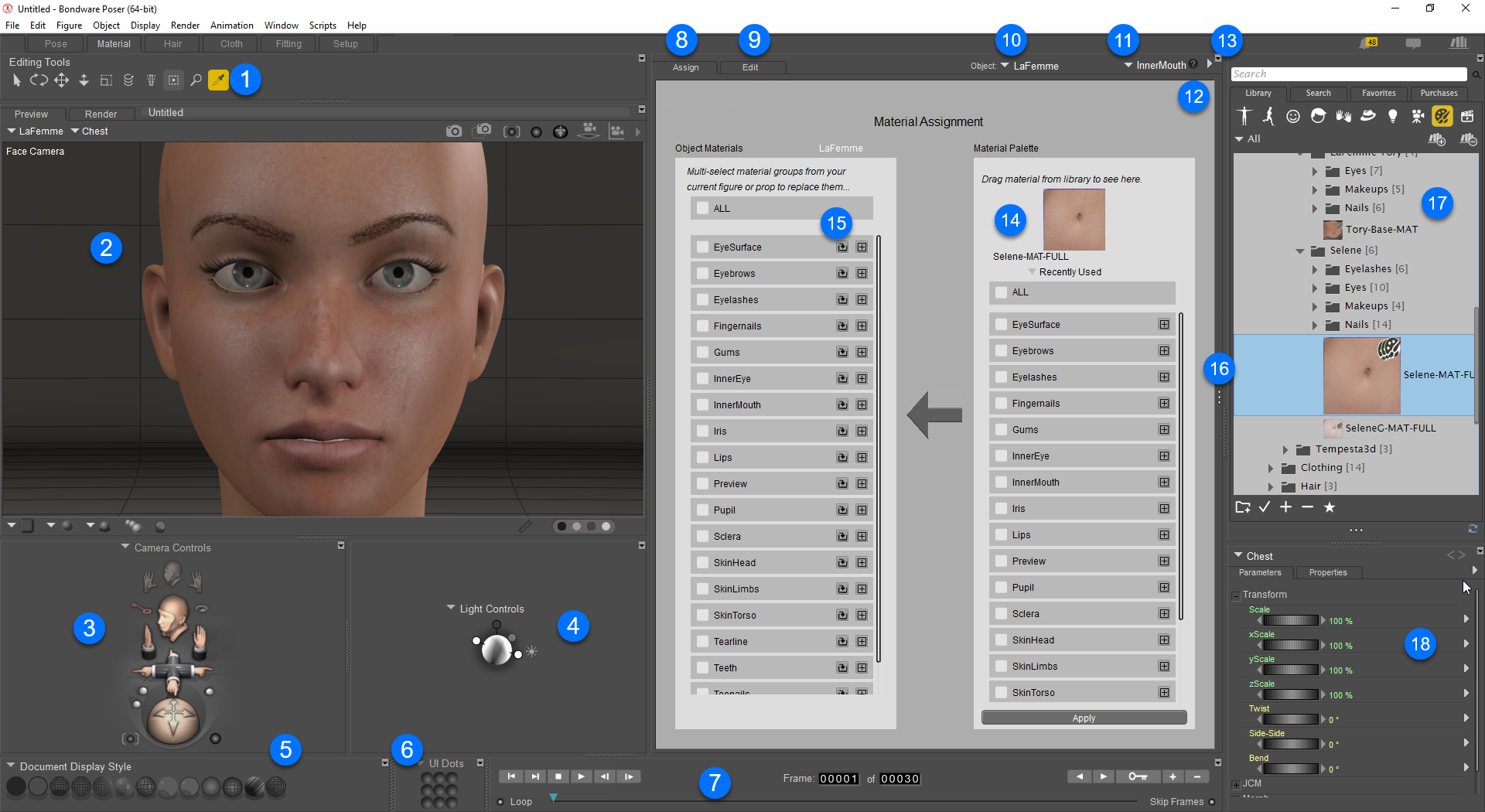 - Library: The Library window appears in the far left section of the Material room if space permits. See The Poser Library.