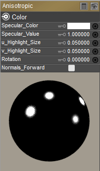 The Anisotropic node allows you to create irregularly shaped highlights. It has the following attributes: