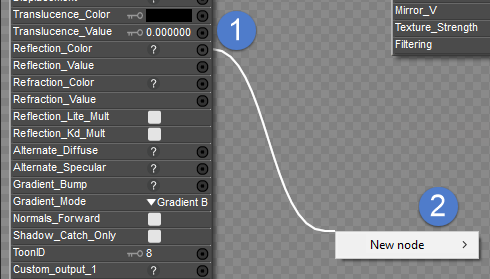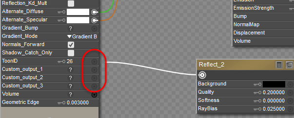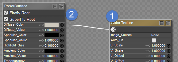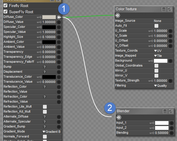 Inputs are black when there is no connection. They are white when another node is plugged in. Also, when your material contains more than two different types of surface root nodes (such as a PoserSurface node and a Physical Surface node), connections will gray out when you try to connect a node type that is “invalid” for that input.