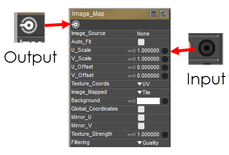 You can link nodes to other nodes, thereby controlling one node’s input with another node’s output. This interaction between nodes is at the heart of the Material room’s functionality and provides nearly infinite flexibility. Node interaction works by plugging values or colors from one node into another. Although only one node’s output can be connected to another node’s input at the same time, there is no theoretical limit to how deep these interactions can go. Available memory and CPU speed will play a role in setting practical limits.