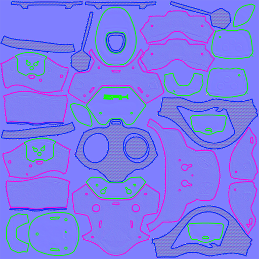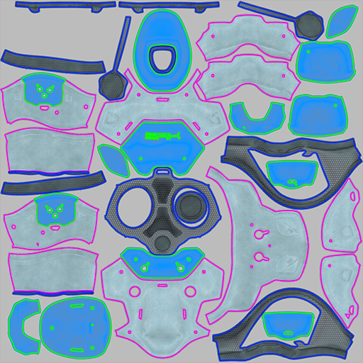 The material zones included in the "Kitty1" maps are as follows. These materials do not need any additional maps such as Opacity, Metallic, or Emission. The outline colors shown in these examples are not actually in the texture maps themselves, they are only used here to help identify the different materials that the maps affect.