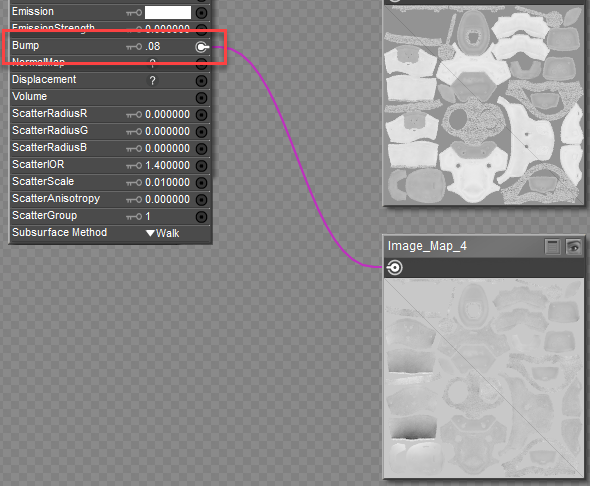 - Connect the output of the Bump map to the Bump input of the Physical Surface node.