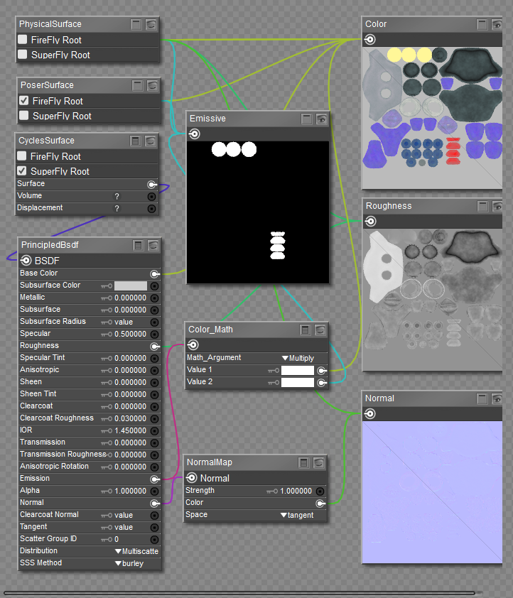 - Connect the output from the Color Math node to the Emission input in the PrincipledBSDF node.