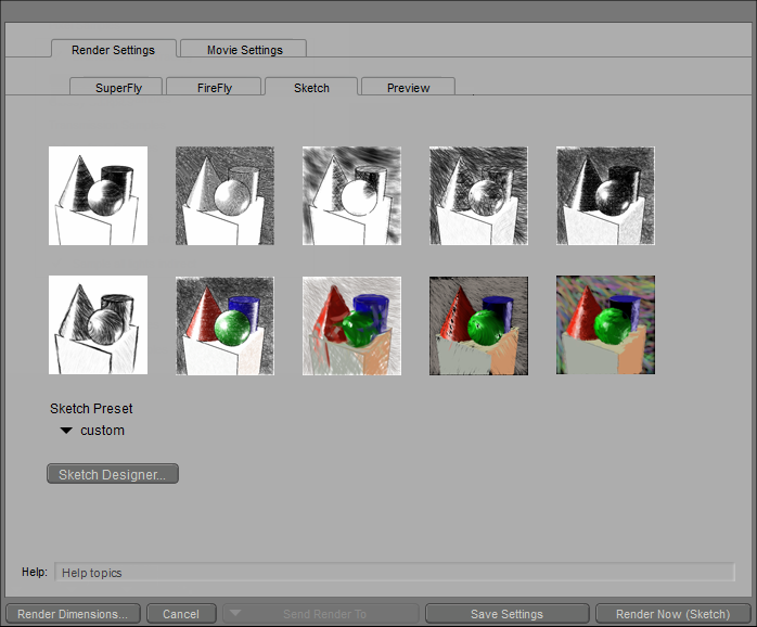 The Sketch Tab provides thumbnail previews of ten standard Sketch preset styles. Simply click on the appropriate thumbnail to select the desired preset, and then click the Render Now button to render your image using those preset values. Alternately, you can use the Sketch Preset pop-up menu to select from a list of standard presets and any custom presets you may have saved using the Sketch Designer.