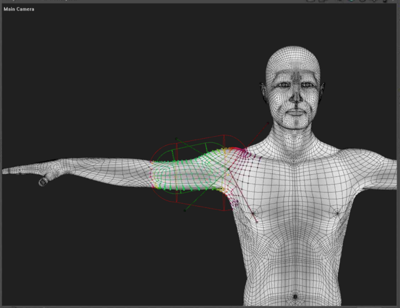 After you add a body part as an affected actor, you’ll want to modify the falloff zones so that they also include the vertices in the affected actor. To illustrate why, observe in the following figure how the falloff zones originally look for the right shoulder: