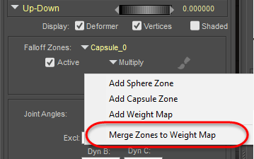 In the Joint Editor, click the Add button, and choose Merge Zones to Weight Map. The weight map will be set to Replace, which will make the spherical and capsule falloff zones ineffective.