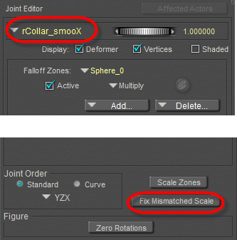 If you are working with a character that makes heavy use of scaling zones, you may sometimes encounter situations where there appears to be something wrong with the scaling in one or more body parts. For example, scaling the chest and could cause the shoulders to scale so that they cause a faulty joint between the shoulders and collars.