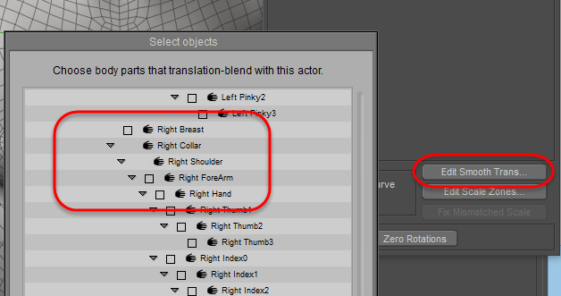 - By default, the adjacent body part blends with the selected part by default. To add other parts for blending, click the Edit Smooth Trans button in the joint editor palette to open the Select Objects hierarchy list. Use this list to choose the body parts that will blend with the selected actor. For example, if you have selected the right collar of a figure, it will blend with the right shoulder.