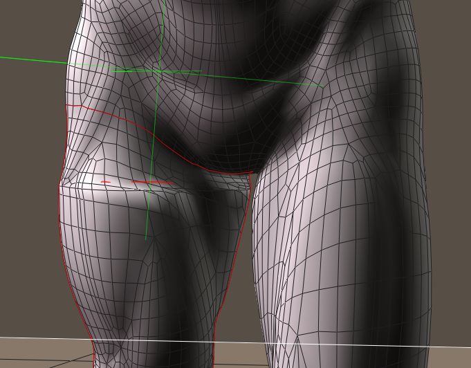 Adjacent body parts may also affect a scale zone. Here, the scale zone for the hip also affects the right thigh and should be smoothed.
