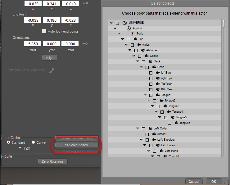 The Scale Zones button at the bottom of the joint editor allows you to add or remove scaling zones to the currently selected body part. At a minimum, adjacent body parts should be selected. But if it is possible that the scaling can “spill over” into other body parts, you can add them as scaling zones as well.