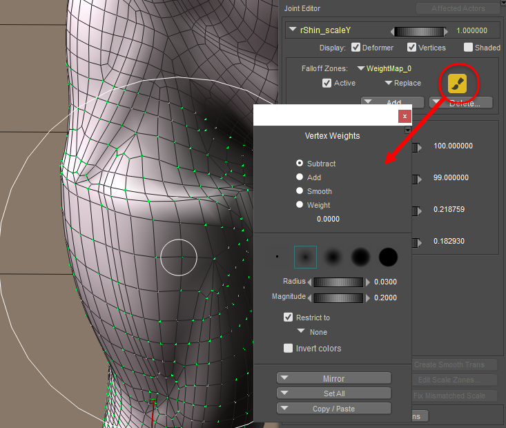 Use the weight painting tools to improve the appearance of the smooth zone (here, in progress)