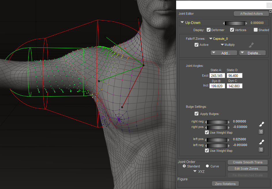 If you are going to be rigging a character from scratch, the easiest workflow is to rig it first the “old fashioned” way … by using spherical and capsule falloff zones as described in the previous sections in this chapter. After you get that done, you can collapse the falloff zones down into weight maps.