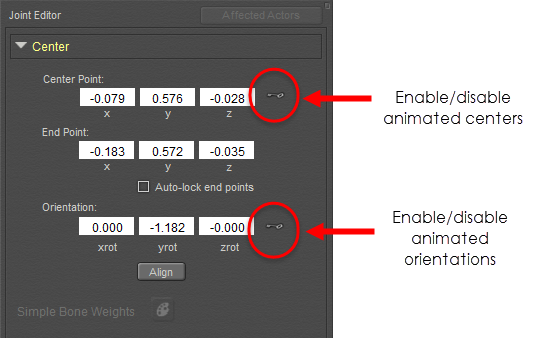After you convert your body parts into weight maps, you can use the Joint Editor to enable or disable animated joint centers or animated orientations for each body part you need to change. Select the joint that you want to configure, and then choose the Center properties in the Joint Editor. There, you will see two key icons that enable or disable animated centers and animated orientation.
