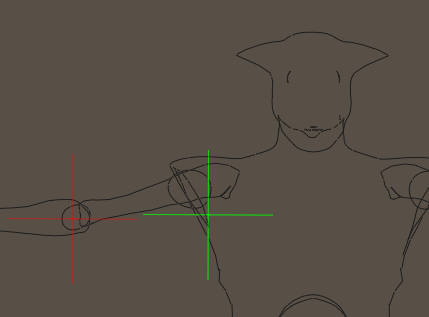 When you’re working on your centers in the Joint Editor, the start and end positions and angles of the selected joint will be displayed. When you select a body part either with the Current Actor menu, or in the Parameters/Properties palette, the information for its center, end point, and orientation will be displayed in the joint editor. The following figure shows the position and orientation of the original Andy’s right shoulder, compared to the outline of the Alien Andy shape. As you can see, the original origin (green crosshair) is not centered on the Alien’s shoulder, and its is